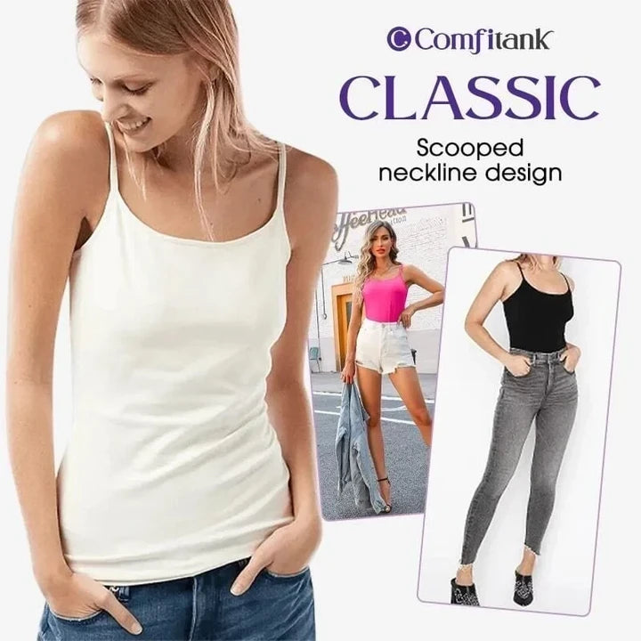 The classic scoop neck design helps make this camisole layer under anything. It's also a solid stand-alone tank with a supportive built-in shelf bra!