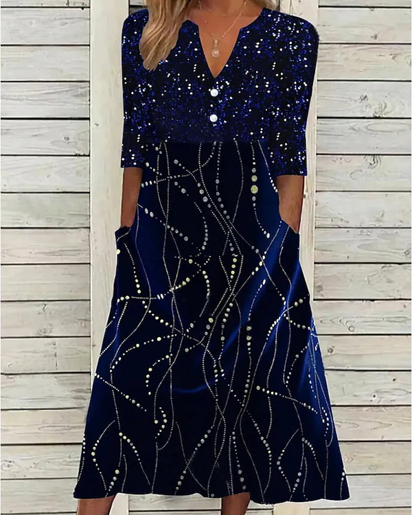 Casual Navy Blue Print Pocket V-Neck Mid Sleeve Dress