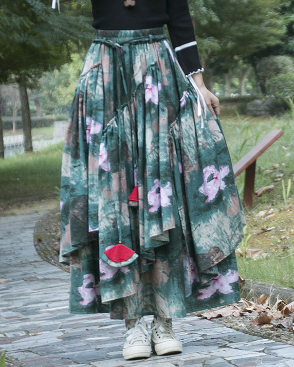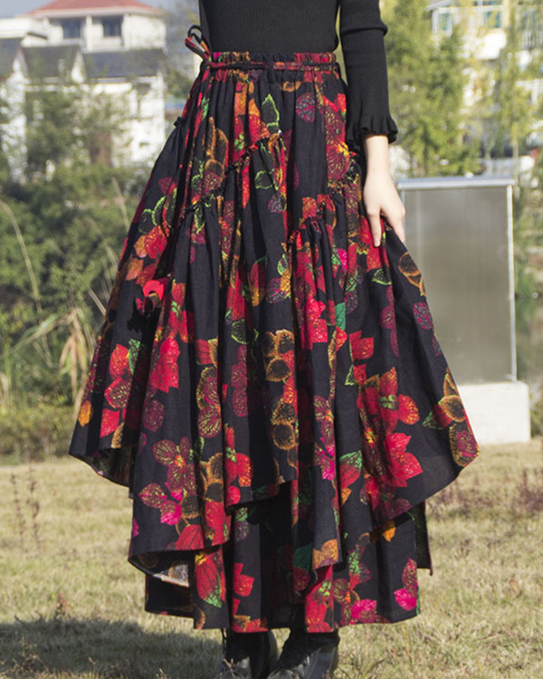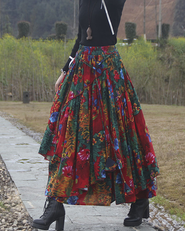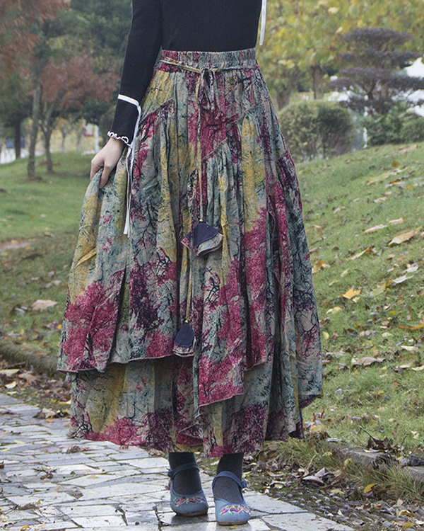 Ethnic Elastic Waist Irregular Linen Printed Skirt