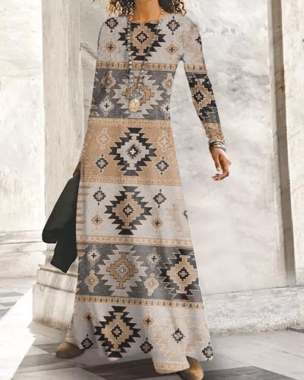 Ethnic Long Sleeve Crew Neck Casual Dresses