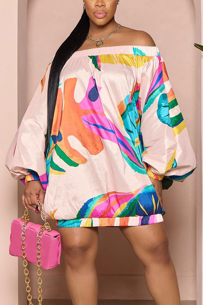 Plus Size Pink Casual Floral Print Off The Shoulder Lantern Sleeve Mini Dress