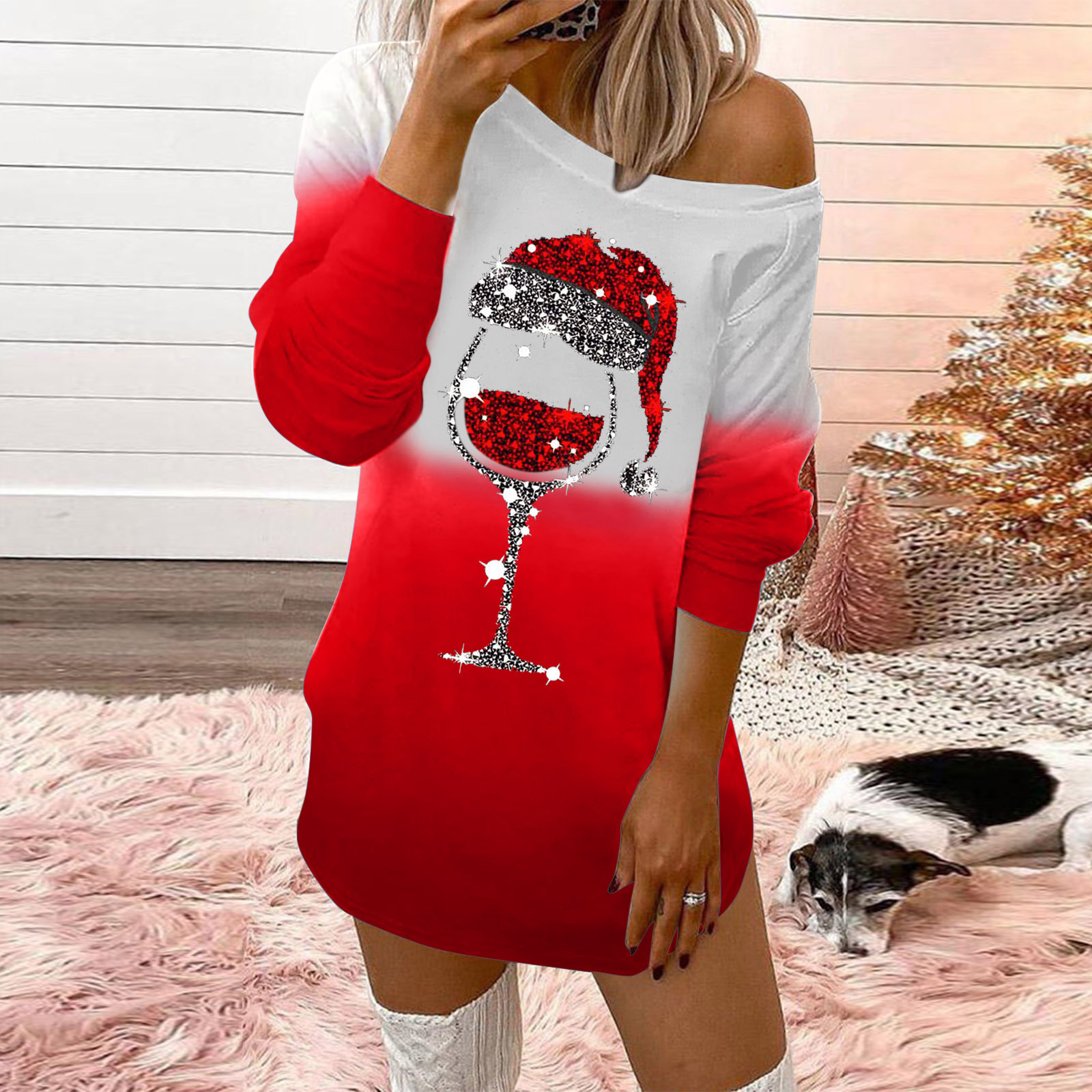 Wine Glass Print Long Sleeve Dress