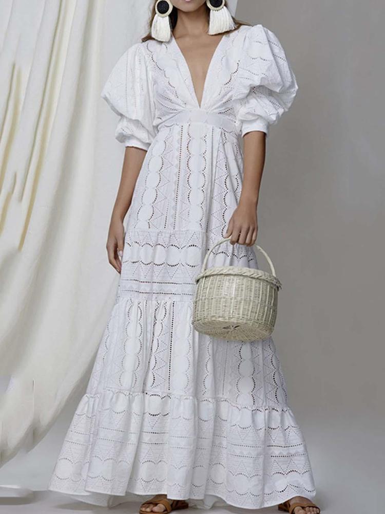 Crochet Hollow Puff Sleeves Maxi Dresses