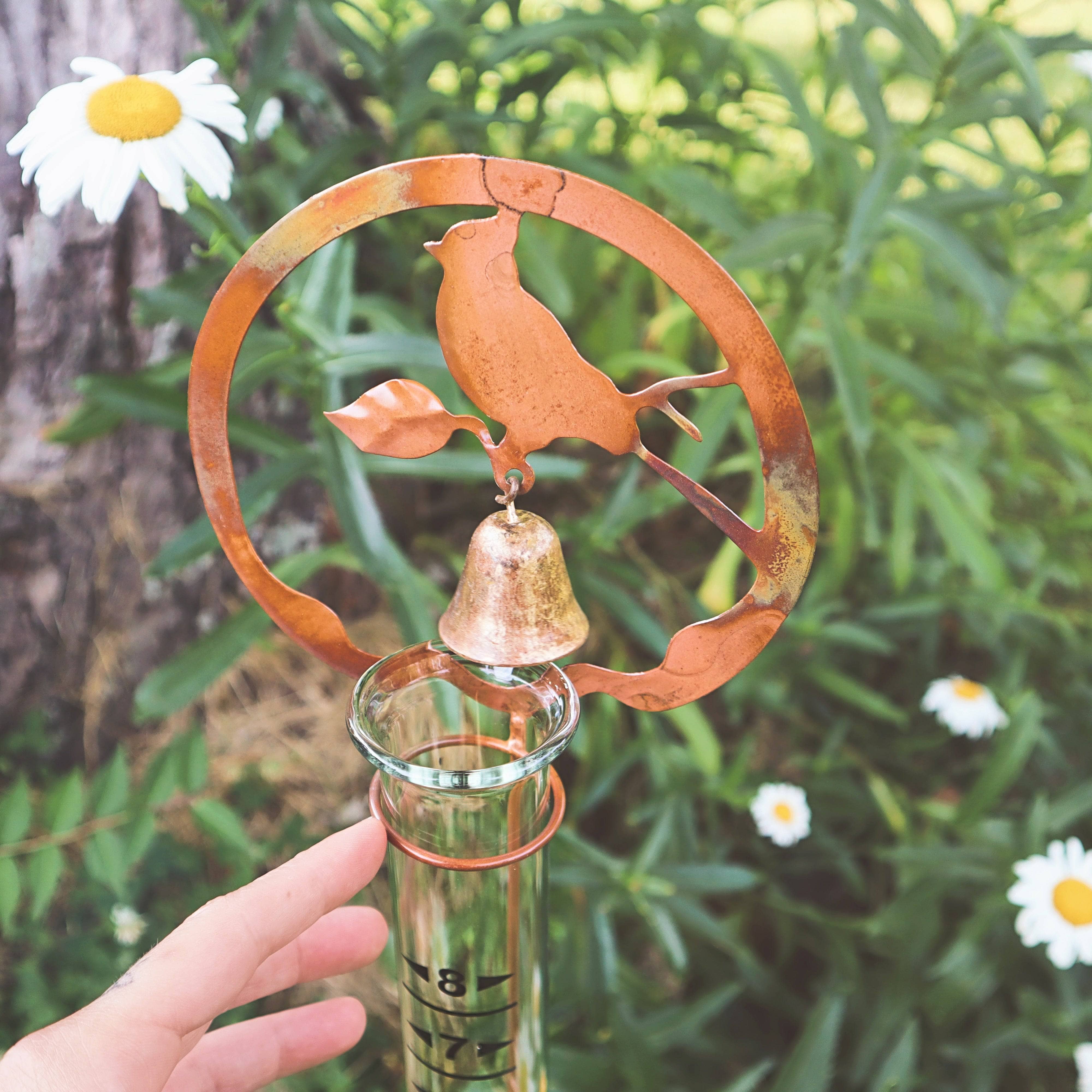 If you’re a serious gardener, then you’re going to measure rainfall. Why not do it in style with our Bird Rain Gauge Stake? This rustic piece includes a fully functional rain gauge plus a lovely, natural-looking medallion that features a perched bird and a tiny, melodious bell. This item makes a perfect gift for any gardener who might have an old, boring rain gauge. Like all of our products, this rain gauge has been individually handcrafted.