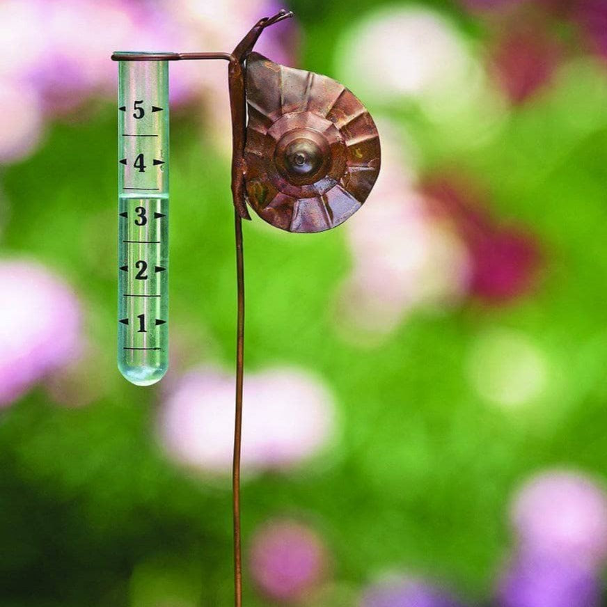 With exquisite spiral shells that symbolize the circle of life, the humble snail reminds us to slow down and enjoy the simple things. This cheerful fellow has paused atop a rain gauge, where he shows off his beautifully sculpted shape and his stunning flamed metal finish, which is versatile enough to complement other garden décor without any risk of clashing. A well-marked glass vessel captures raindrops, allowing you to keep tabs on precipitation levels. Like all Happy Gardens rain gauges, this one is handcrafted, and brings lasting beauty to your lawn or garden.