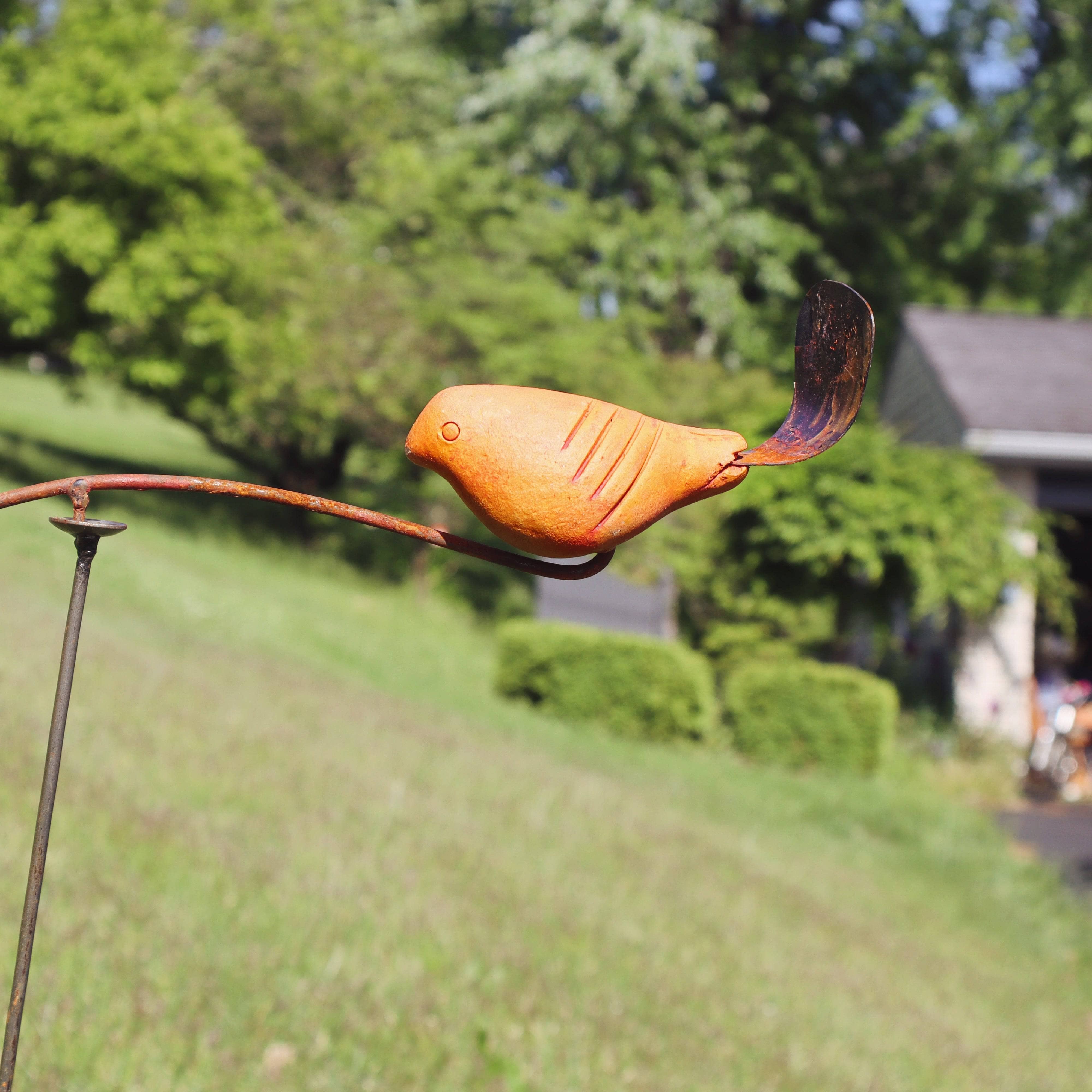 This Spice Garden Balancer will bring a touch of kinetic energy to your garden, lawn or flowerbed. This moving sculpture features a cute little bird perched on a branch with detailed leaves. Perfect for a flower bed, and right at home in a potted plant, this whimsical piece makes a fun addition to any outdoor space. Like all our ornaments and statues, this Happy Gardens item is individually handcrafted.