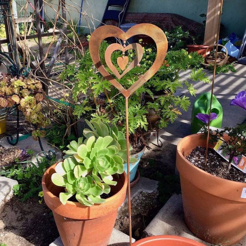 Add a touch of romance to your garden with this best-selling Triple Spinning Heart Garden Stake. This piece has a neutral, iridescent glow that really stands out in green, grassy or leafy areas. This stake spins in the breeze, too, making it even more interesting to onlookers. As always, this item in individually handcrafted and made with care.