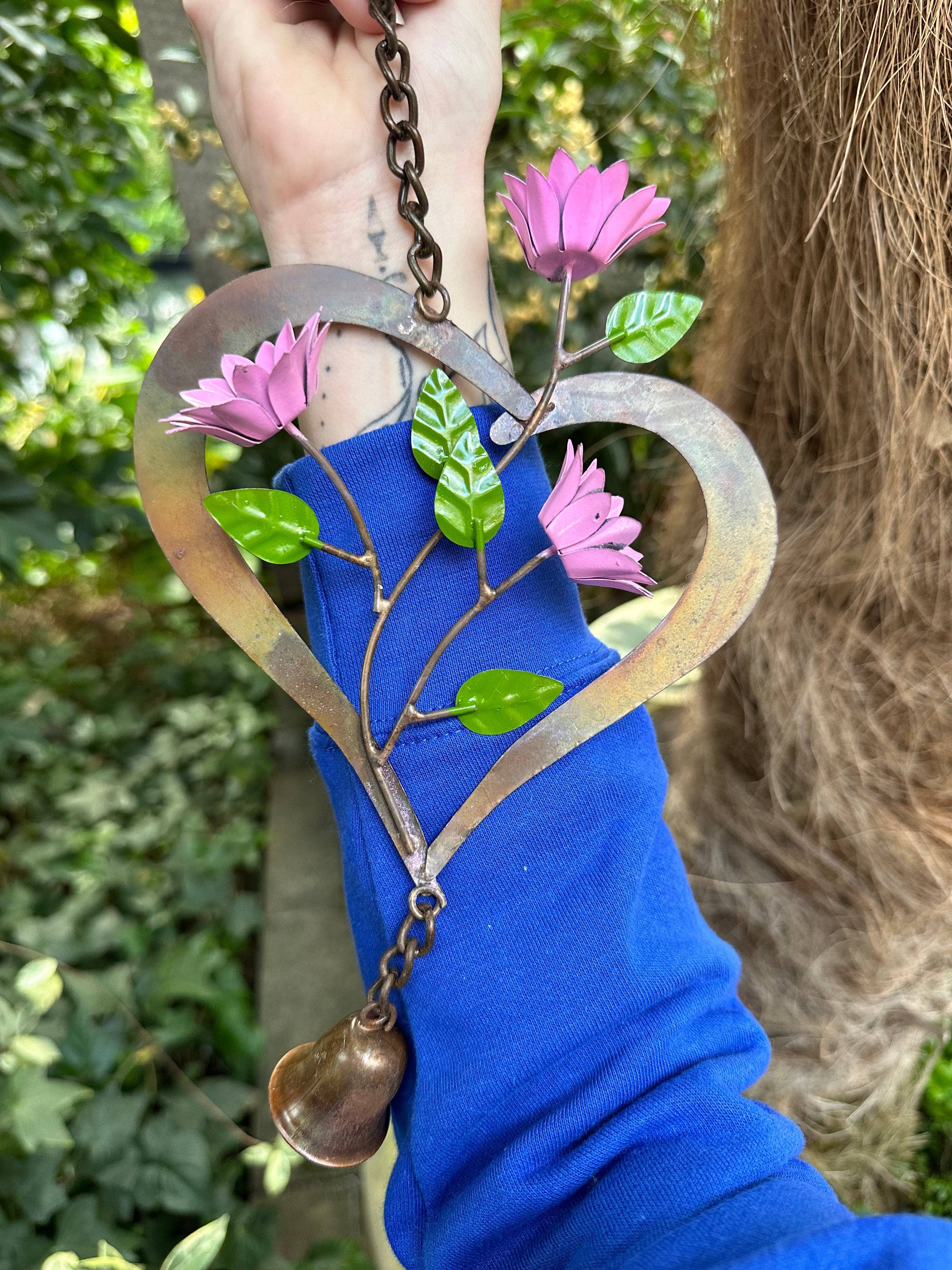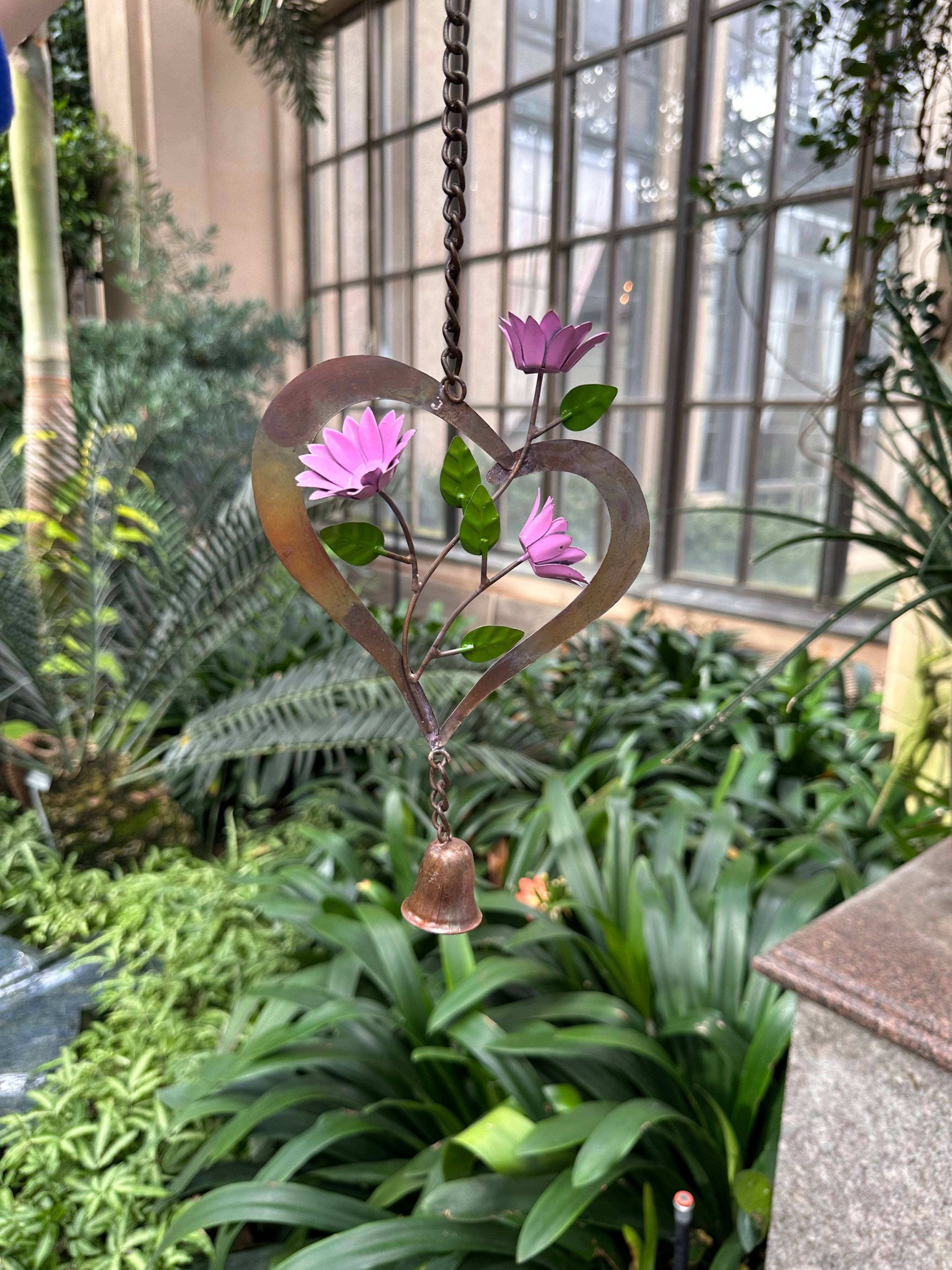 Celebrate spring all year round with this breathtaking hanging ornament. Featuring a handcrafted heart, a stem of stunning lilac blooms, and a whimsical bell, there’s no sweeter way to add a little something to your outdoor space than with this piece of garden decor. Best of all, it’s easy to install, and its flamed metal finish will only develop more character over time.