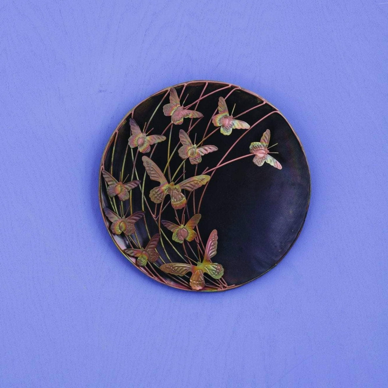 Marvelous details make our 12” Flamed Raised Butterflies Wall Disc a favorite for indoor and outdoor use. Offering a touch of subtle color and lots of texture, it implies motion via a lovely blending of raised elements and negative space. This fantastic hanging is sized to fit nearly anywhere, and serves as an attractive focal point. Like other Happy Gardens wall decor, this disc has been individually handcrafted, and will bring lasting beauty to your home or outbuilding.