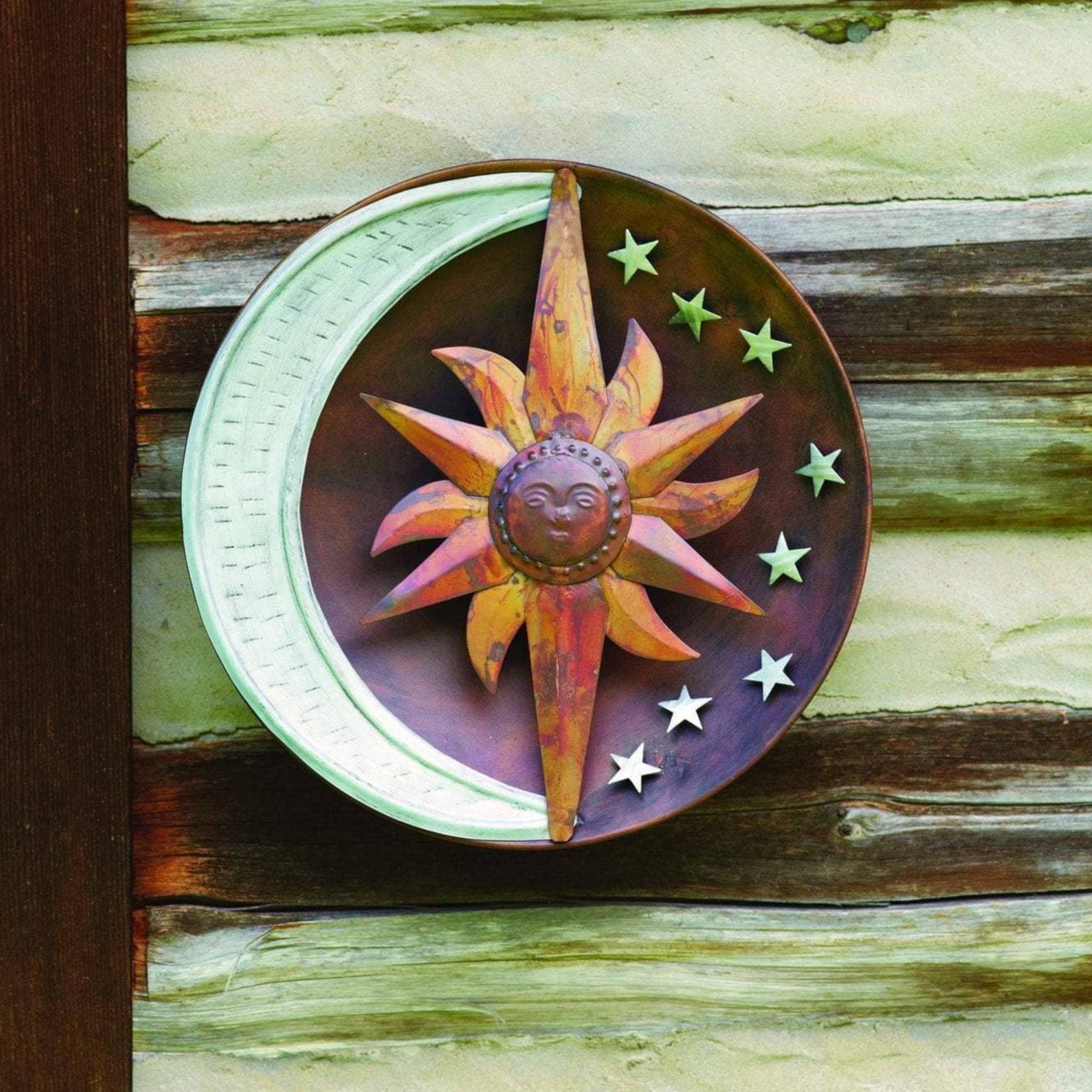 Our 12” Flamed Zinc Raised Celestial Wall Disc is beautifully detailed, and sized to fit comfortably in a variety of settings. Wonderful for indoor or outdoor use, it brings a touch of whimsical charm along with it. This piece features zinc moon and stars, plus a flamed sun with a warm, cheerful countenance. Like other Happy Gardens wall decor, this disc has been individually handcrafted, and will bring lasting beauty to your home.